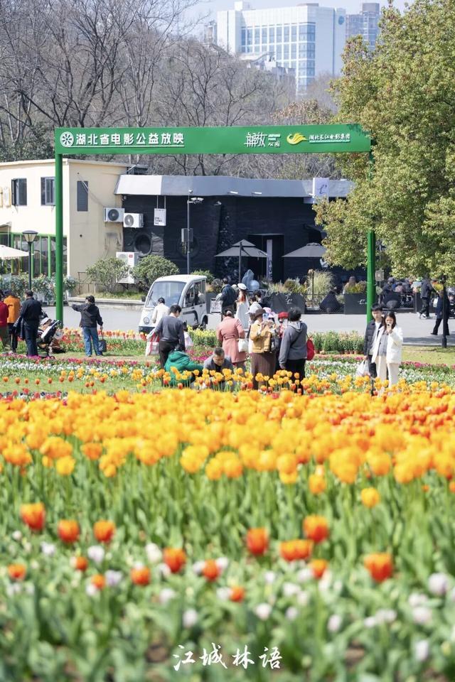 从公园2号门入园后右转,沿着文华桥方向走,很快就能看到今年花展最惊喜的一处景观——湖畔铺开的水岸郁金香花境。