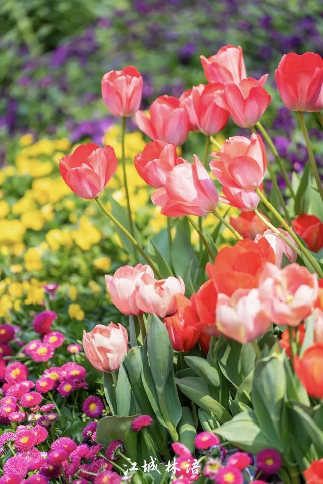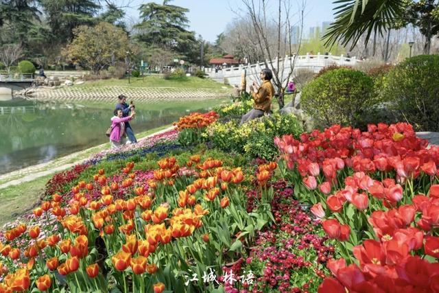近百米长的彩色花带顺着驳岸延展,红黄相间的郁金香与紫色角堇交织,其间点缀雏菊、金鱼草等多种草花,像调色盘落在湖边。