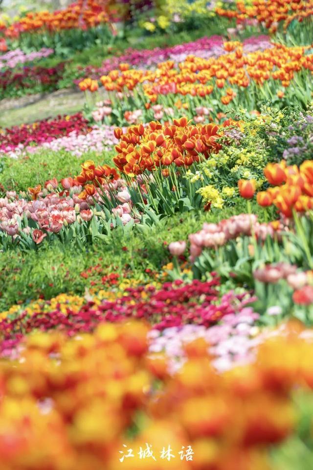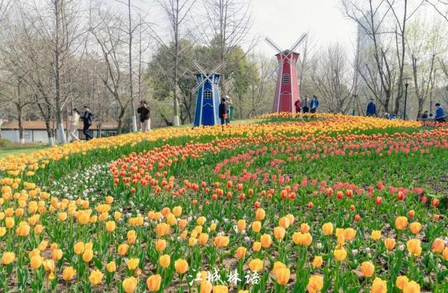站在坡顶俯瞰,S形花径在花海中蜿蜒;走到低处仰拍,郁金香、风车与蓝天同框;再远一点,城市天际线也会悄悄进入画面。不同角度望去,每一处都像画布上的一笔春色。