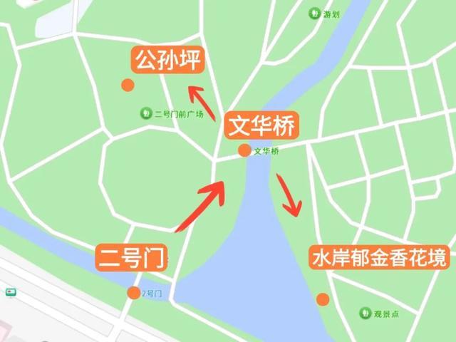 自驾游客可停在公园2号门停车点,周末建议尽量绿色出行。从2号门入园,依次经过湖岸花境、文华桥和公孙坪主花海,一圈慢慢逛下来,大约一个小时就能把这片春天看个尽兴。