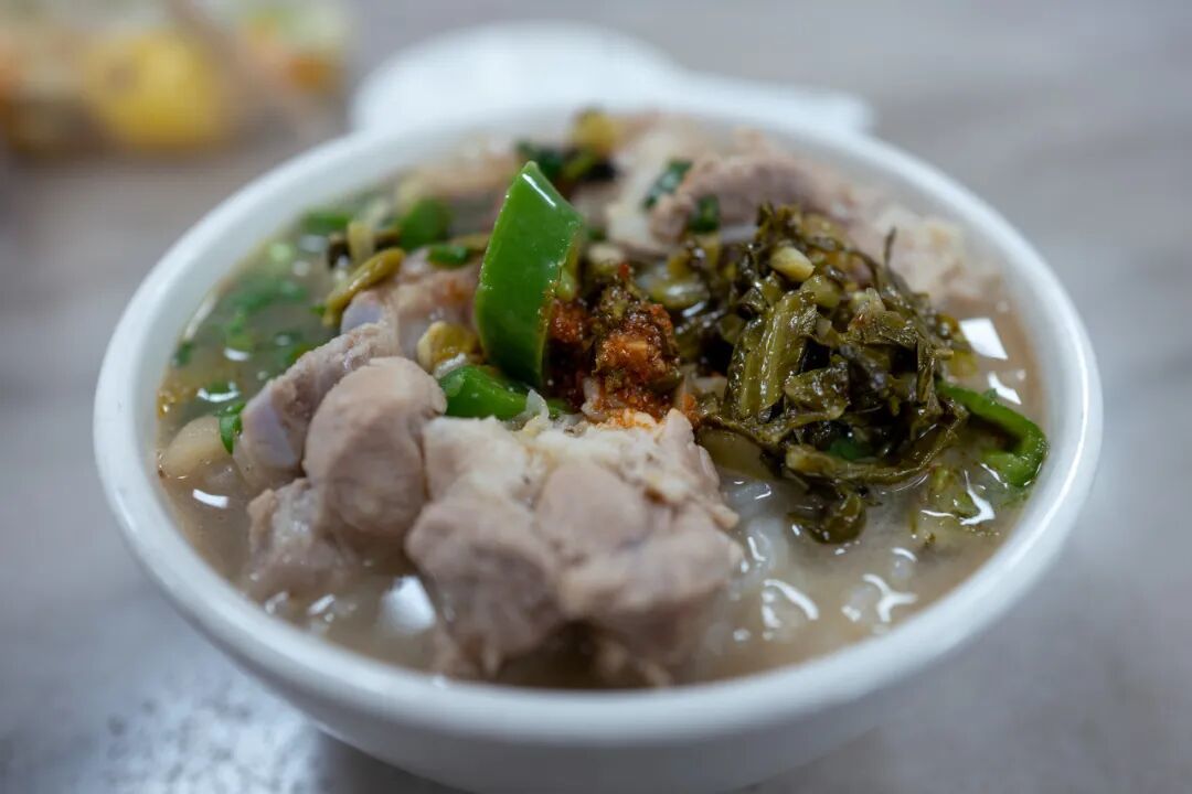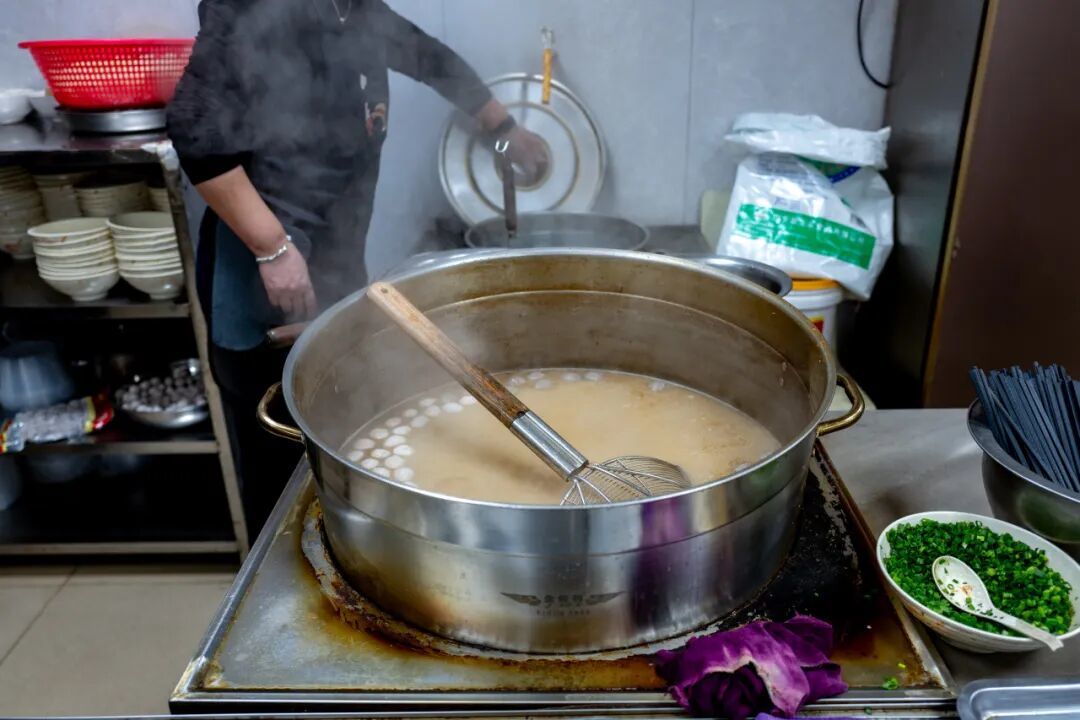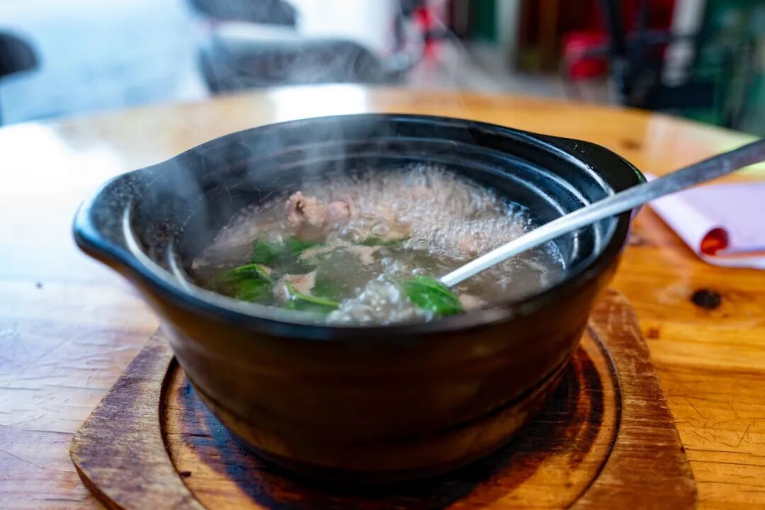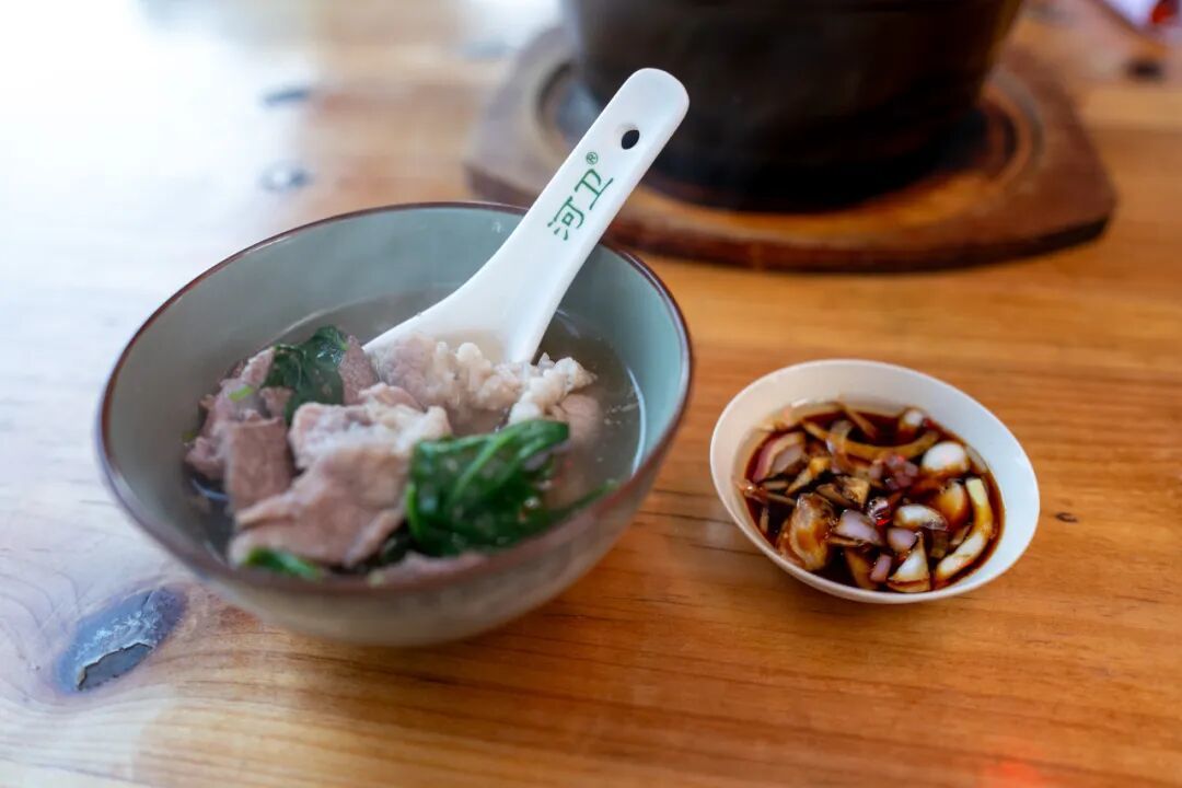 猪肯定不能是冷冻猪,不然吃起来膻。汤底加入了胡椒粉,辛辣提鲜,喝一碗汤能滋出一脑门汗来。