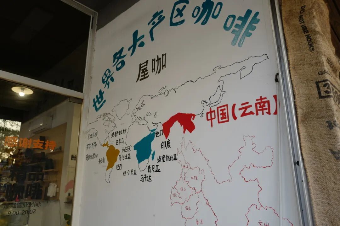 河源也有自烘焙咖啡店,就是这家屋咖。门口画了涂鸦,普及世界各大咖啡产区。