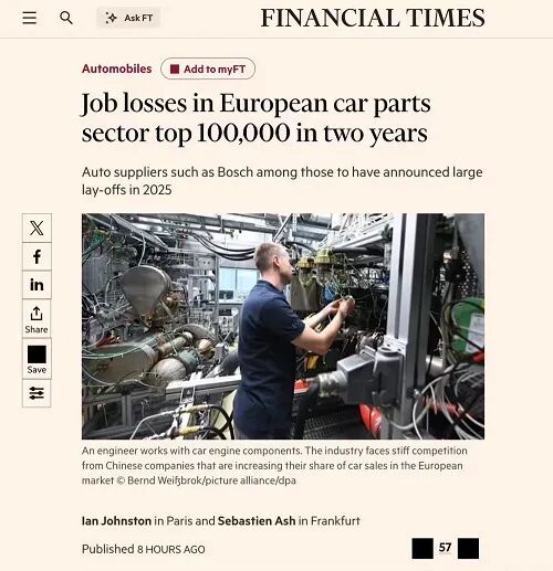 一辆纯电车所需的机械零部件比同级别的燃油车减少了30%-40%,发动机、变速箱、传动、排气系统等传统的核心模块在电动化浪潮中迅速边缘化,而这些正是欧洲零部件产业几十年来最重要的就业载体。