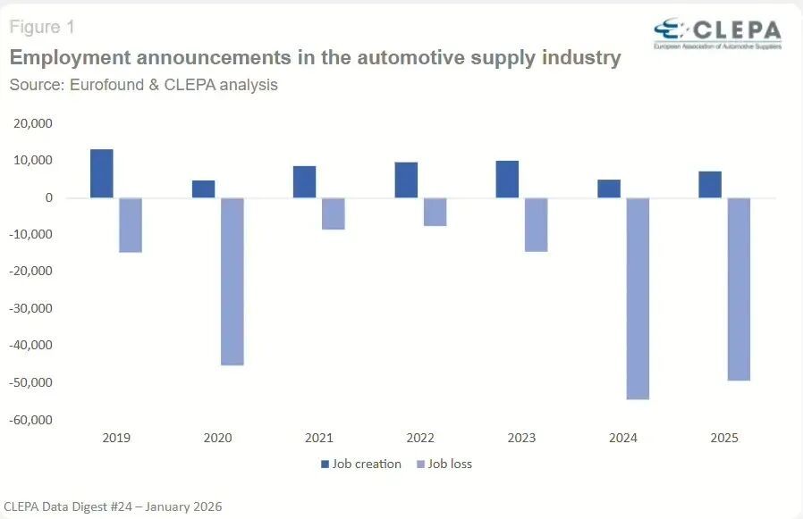 年初,据欧洲汽车零部件供应商协会(CLEPA)发布的数据显示,2024年至2025年,欧洲汽车零部件行业累计官宣裁员人数达10.4万人。